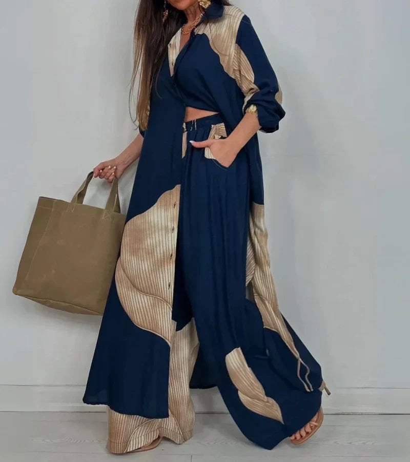 Esprimi il tuo stile con eleganza e naturalezza grazie al completo Moriel. Questo set due pezzi abbina una blusa fluida e un pantalone a gamba larga, impreziositi da una stampa artistica raffinata. Leggero e traspirante, è perfetto per le giornate di sole o le serate casual mantenendo un tocco chic. Il taglio morbido valorizza la silhouette femminile e moderna senza rinunciare al comfort. Attira gli sguardi con questo look sofisticato e facile da indossare.