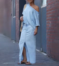 Pensato per valorizzare ogni silhouette, questo set alla moda unisce una t-shirt fluida con spalle scoperte a una gonna lunga con spacco frontale, per un tocco bohémien e moderno.